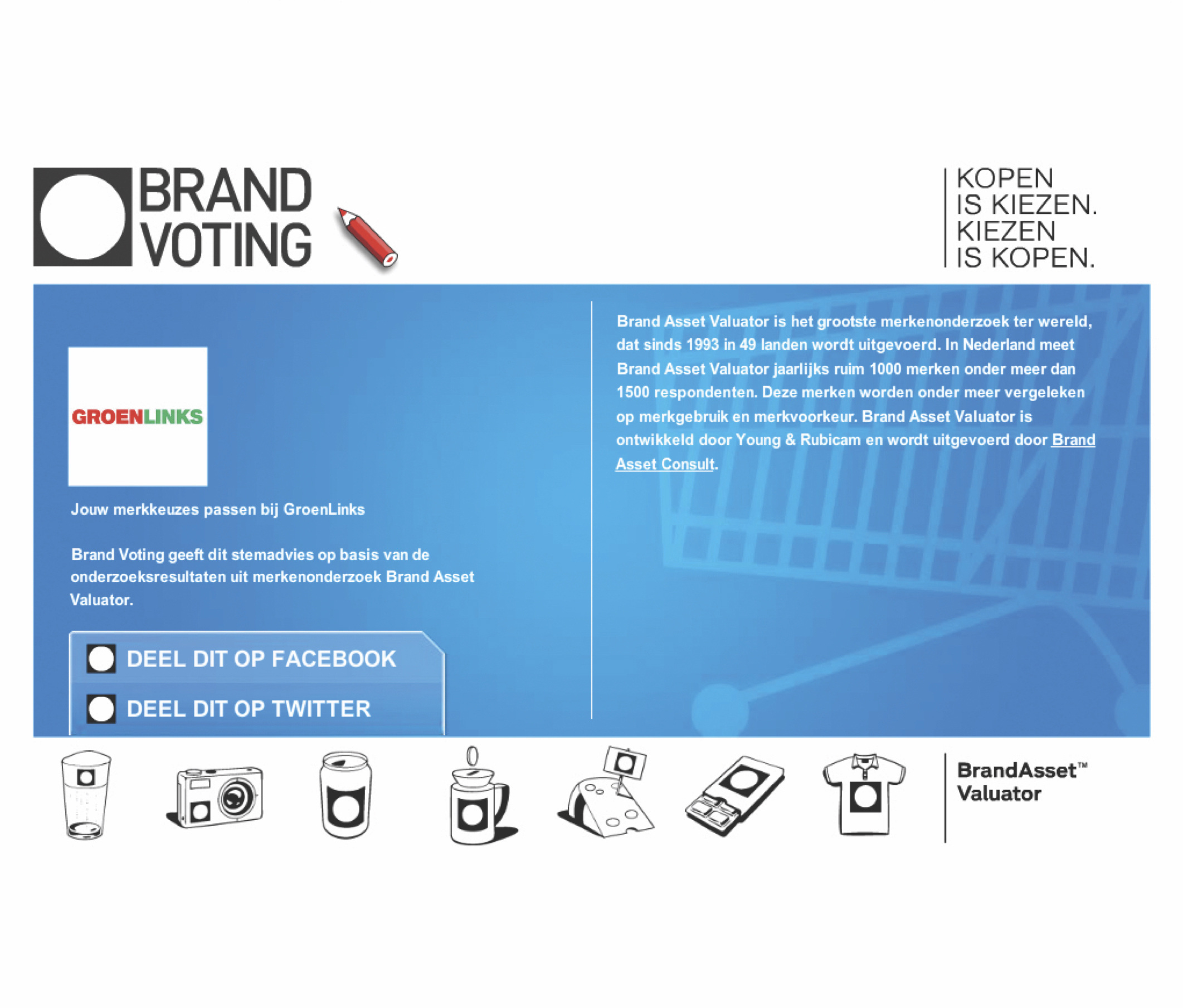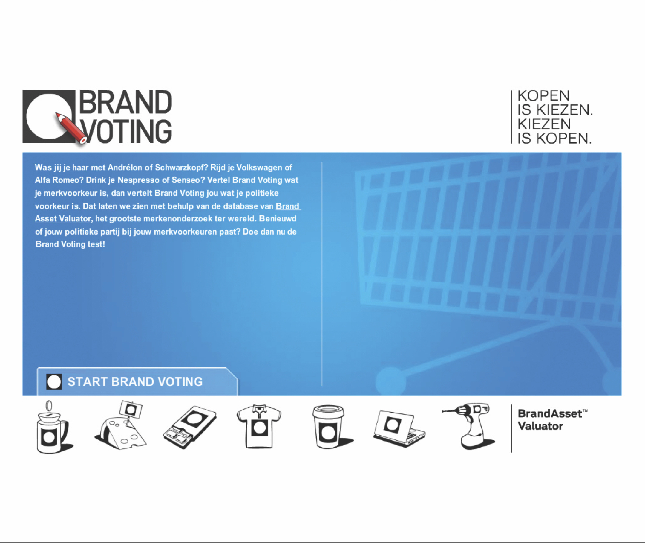 Brandvoting.nl was created for brand research agency Brand Asset Consult when the Dutch parliamentary elections reached critical mass. A record amount of Netherlanders did not know what political party to vote for. We turned our client's product – research data – into an alternative way of choosing a party, using people's brand behaviour to calculate which party suits them best. The result hijacked the nation's conversation.