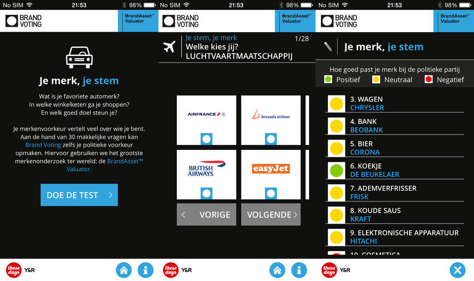 Brand Voting ran again the year after. And our Belgian neighbours ran it during their general elections in 2014. They made it available as a mobile application. Radio spots, banners and free publicity drove over 50.000 people to the website in just 2 days. In print we acted as spin doctor, giving party leaders brand advice.